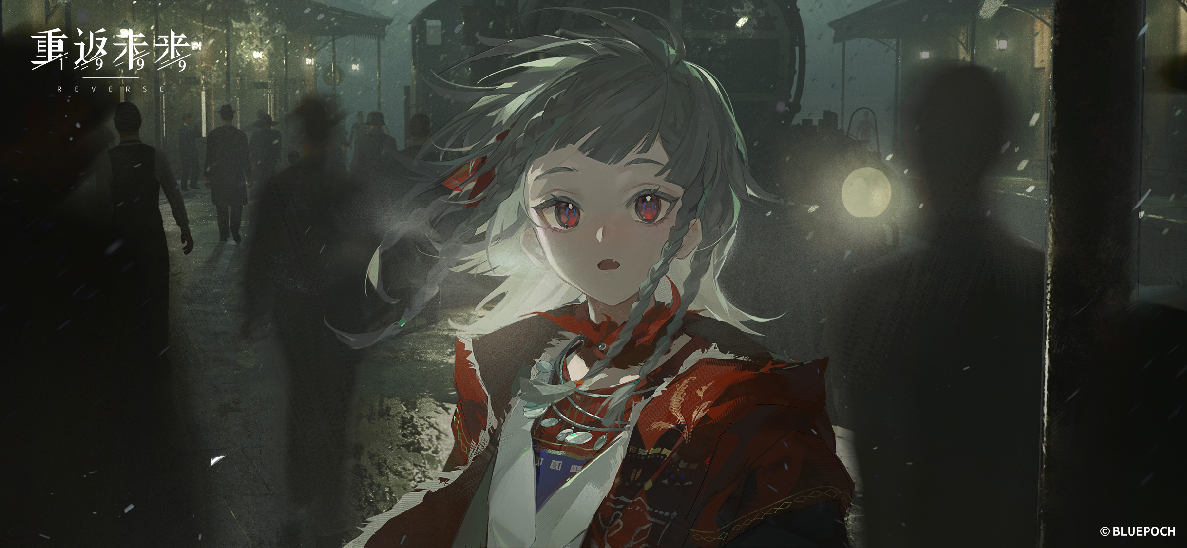 1girlbacklightingblack coatcloakcoatcopyright namecopyright noticefanggrey hairjacketlocomotivelogolooking at viewermedium hairmotion blurnightnight skyopen mouthpeoplequad braidsred cloakred eyesskin fangskysnowingsolo focussteam locomotivetraintrain stationupper bodywhite jacket