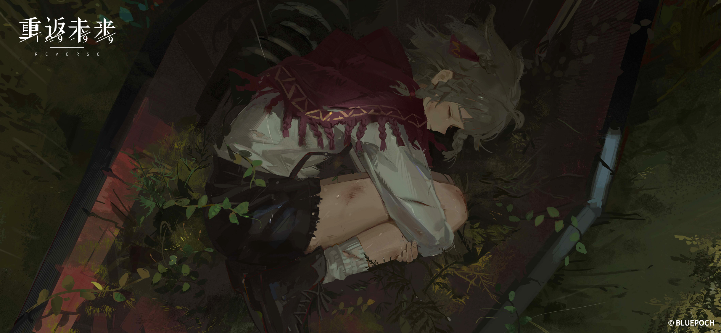 1girlaged downankle bootsblack bootsblack shortsbootscloakclosed eyescoffincopyright namecopyright noticecurled upfetal positionfull bodygrassgrey hairhugging own legslogolyingon sideplantprofilered cloakshirtshort hairshortssleepingsockssolosuspender shortssuspenderswhite shirtwhite socks