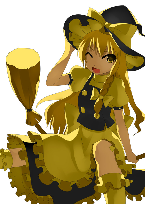 1girlblonde hairbroomfemale focushatone eye closedsimple backgroundskirtsolothighhighswhite backgroundwinkwitchwitch hatyellow eyes