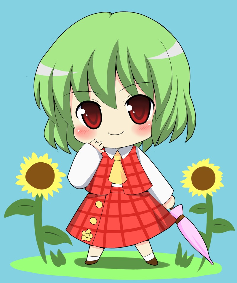 1girlascotblue backgroundchibiclosed umbrellafemale focusflowergreen hairplaid clothesplaid skirtplaid vestred eyesshort hairskirtskirt setsmilesolosunflowerumbrellavest