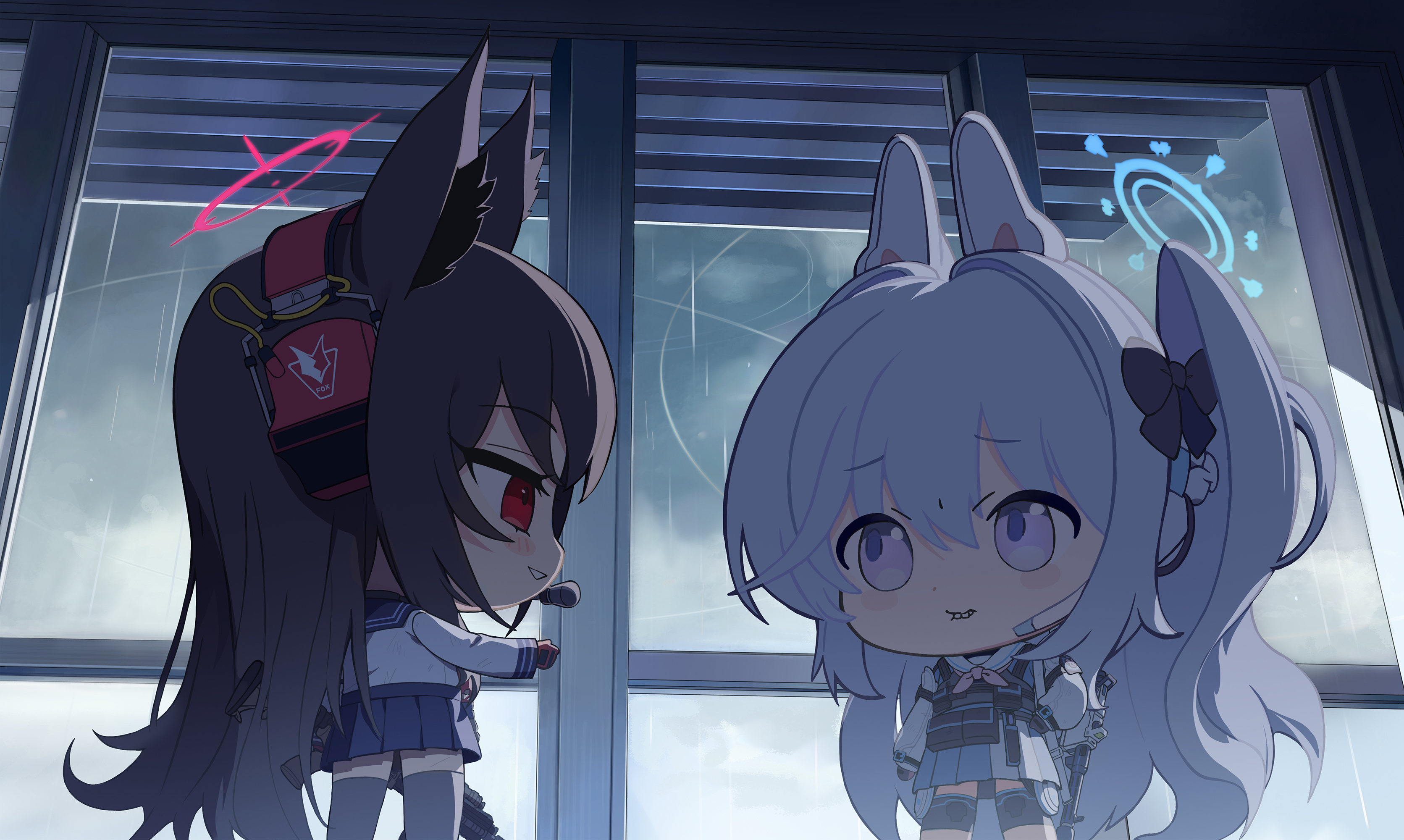 2girlsanimal earsblack hairblue haloblue sailor collarblue skirtblushchibichibi onlygrey thighhighsgunhaloheadsetlong hairlooking at anothermultiple girlsneckerchiefone side uppink neckerchiefpleated skirtprofilepurple eyesrabbit earsrainred eyesred halosailor collarschool uniformserafukuskirtsubmachine gunsuomi kp/-31thighhighsvery long hairweaponwhite hairwhite sailor collar