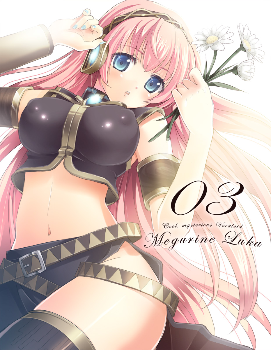 1girlarmbandbeltblue eyesblue nailsbreastscovered erect nipplescrop topcrop top overhangdaisy (flower)female focusflowerheadsetlarge breastslong hairmidriffnail polishnavelnipplespink hairpuffy nipplesshiny skinsolothighhighs