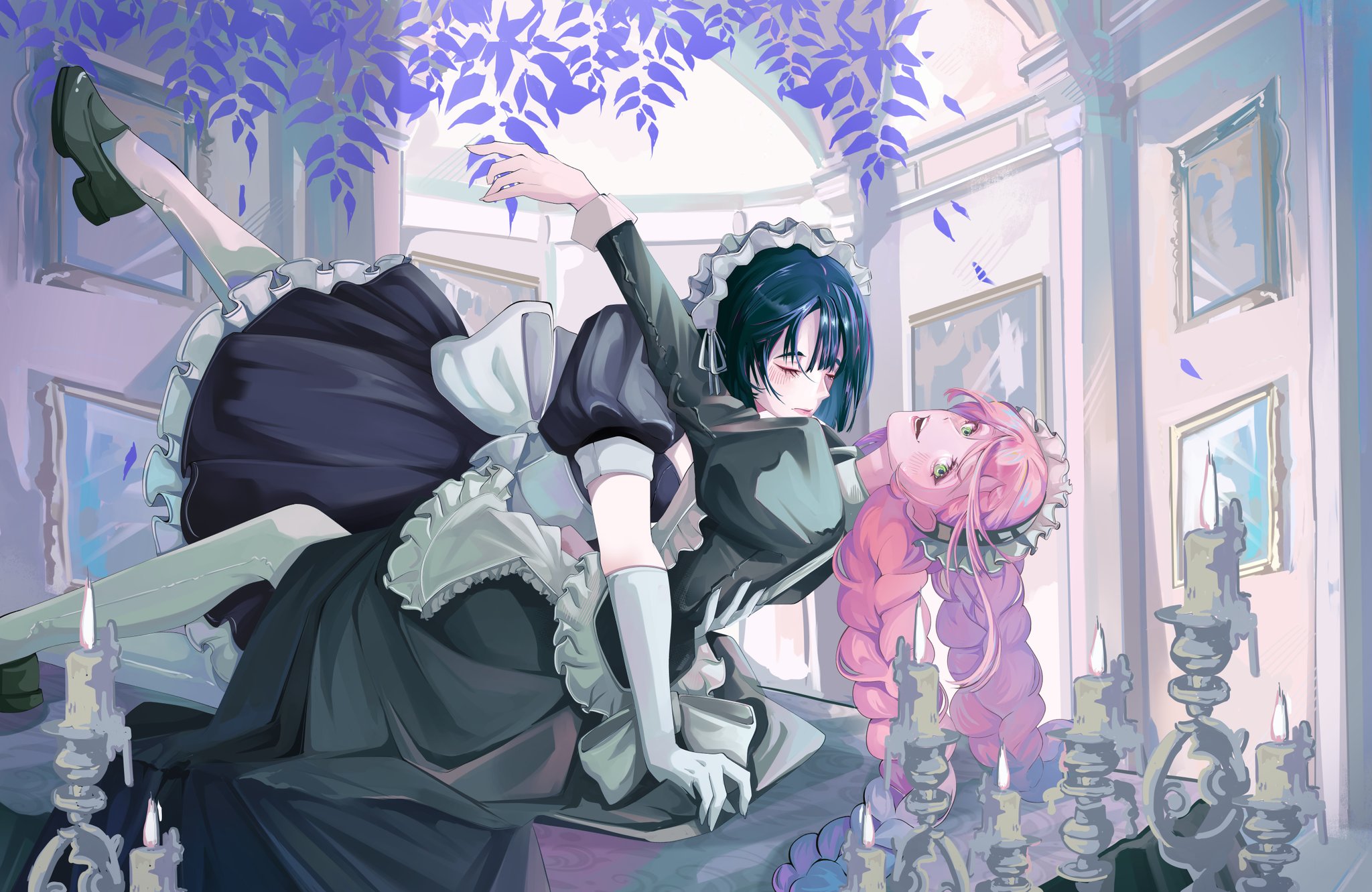 2girlsapronblack dressblack hairblack shoesblue hairbraidcandlecandlestandclosed eyesdresselbow glovesglovesgreen eyesjuliet sleevesloaferslong hairlong sleevesmaidmaid headdressmulticolored hairmultiple girlsofficial alternate costumepainting (object)pantyhosepink hairpuffy short sleevespuffy sleevesshoesshort hairshort sleevestwin braidstwo-tone hairvery long hairwhite apronwhite gloveswhite pantyhosewohooyuri