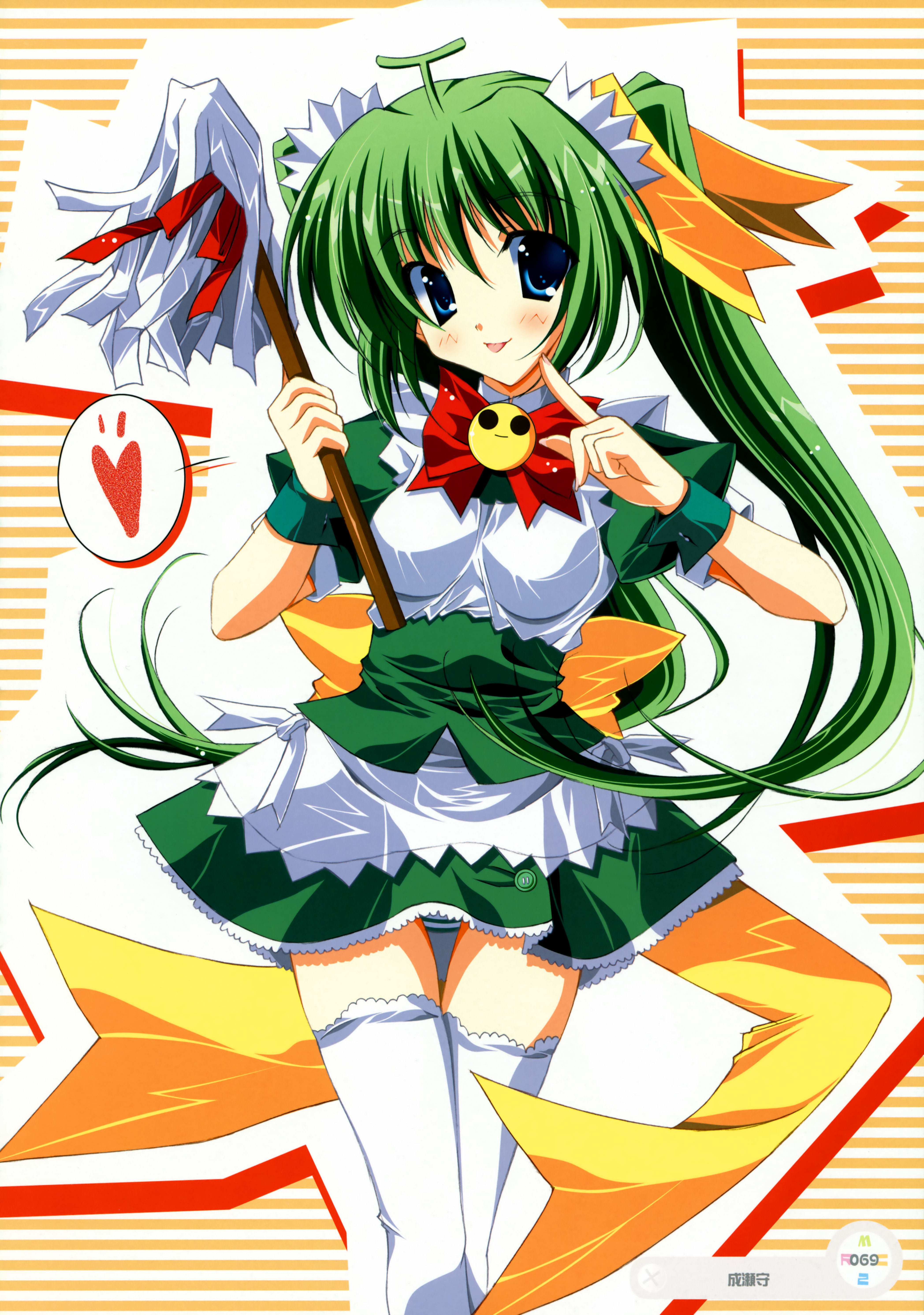 1girlblue eyesblushbowfemale focusgreen hairlong hairmaidmopsolothighhighstwintailswhite thighhighsyellow bowzettai ryouiki