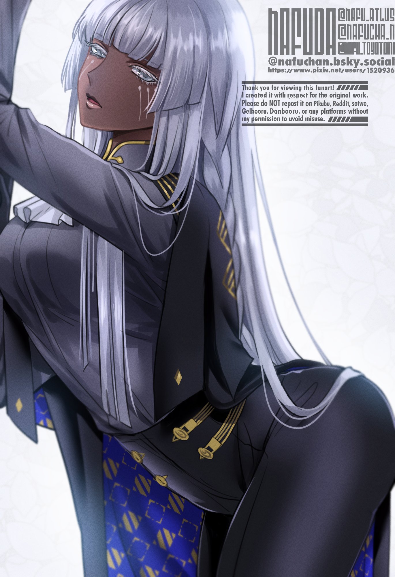 1girlartist nameascotblack pantsdark skindark-skinned femaleeyelashesgrey eyesgrey hairhigh-waist pantsleaning forwardlong hairlooking at vieweropen mouthpantssolotwitter usernamevery dark skinwatermarkwhite ascotwhite background