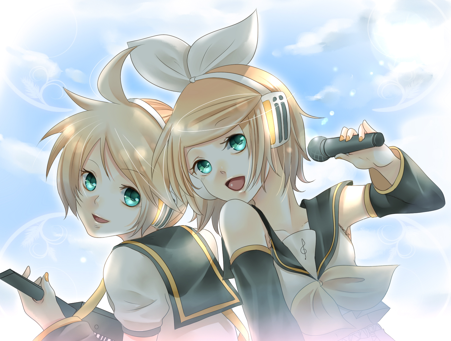 1boy1girlblonde hairblue eyesbrother and sisterdetached sleeveshair ornamenthairclipheadphonesmicrophoneribbonshort hairsiblingstwins