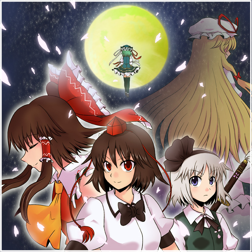 5girlsasymmetrical clothesclosed eyesfemale focushatmultiple girlsoutdoorspetalsskirtskythighhighstokin hatupper bodyzettai ryouiki