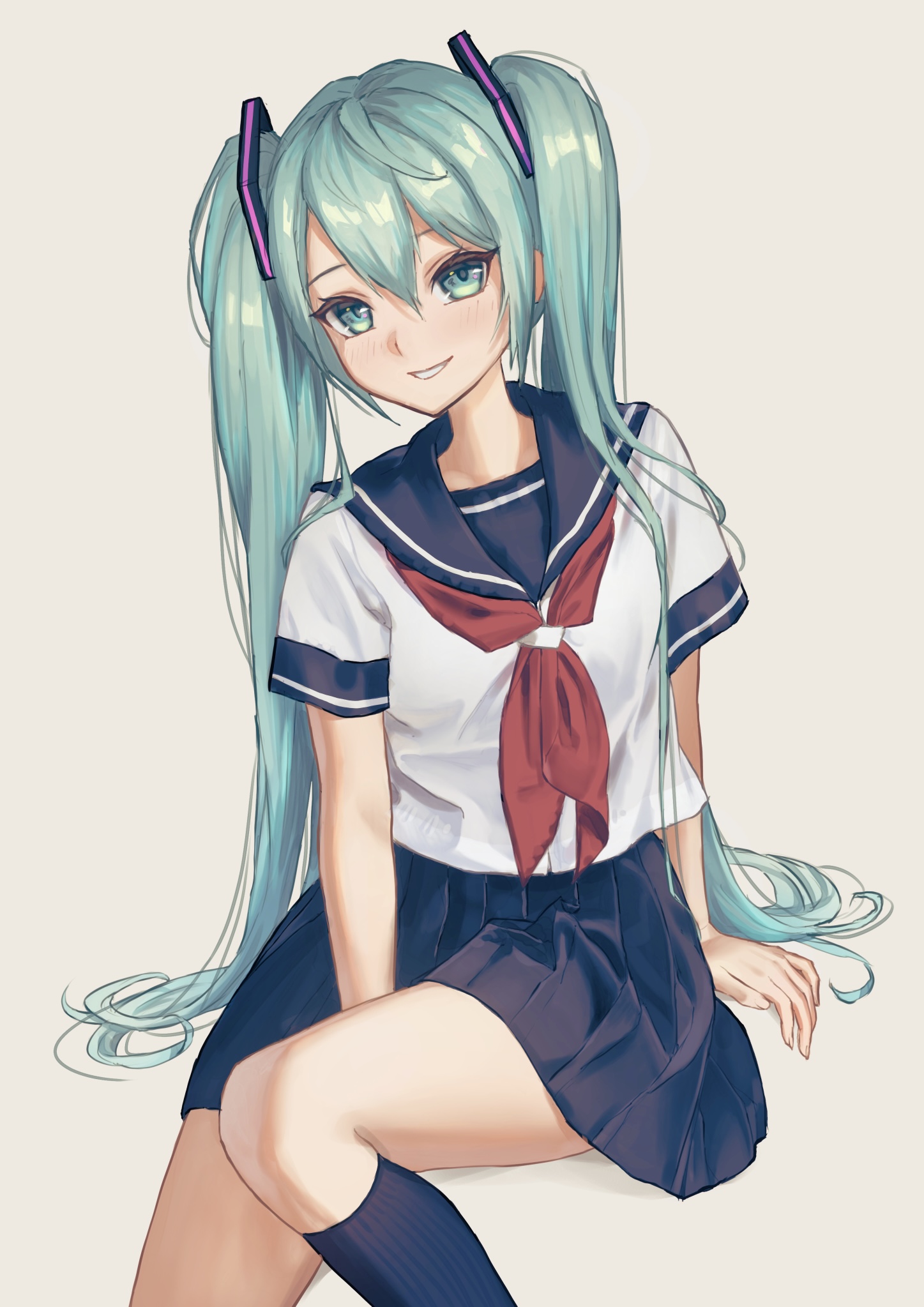 1girlaqua eyesaqua hairblue serafukublue skirtblue socksbrown backgroundhair between eyeslong hairneckerchiefpleated skirtred neckerchiefschool uniformserafukushirtsittingskirtsmilesockssolotwintailsvery long hairwhite shirt