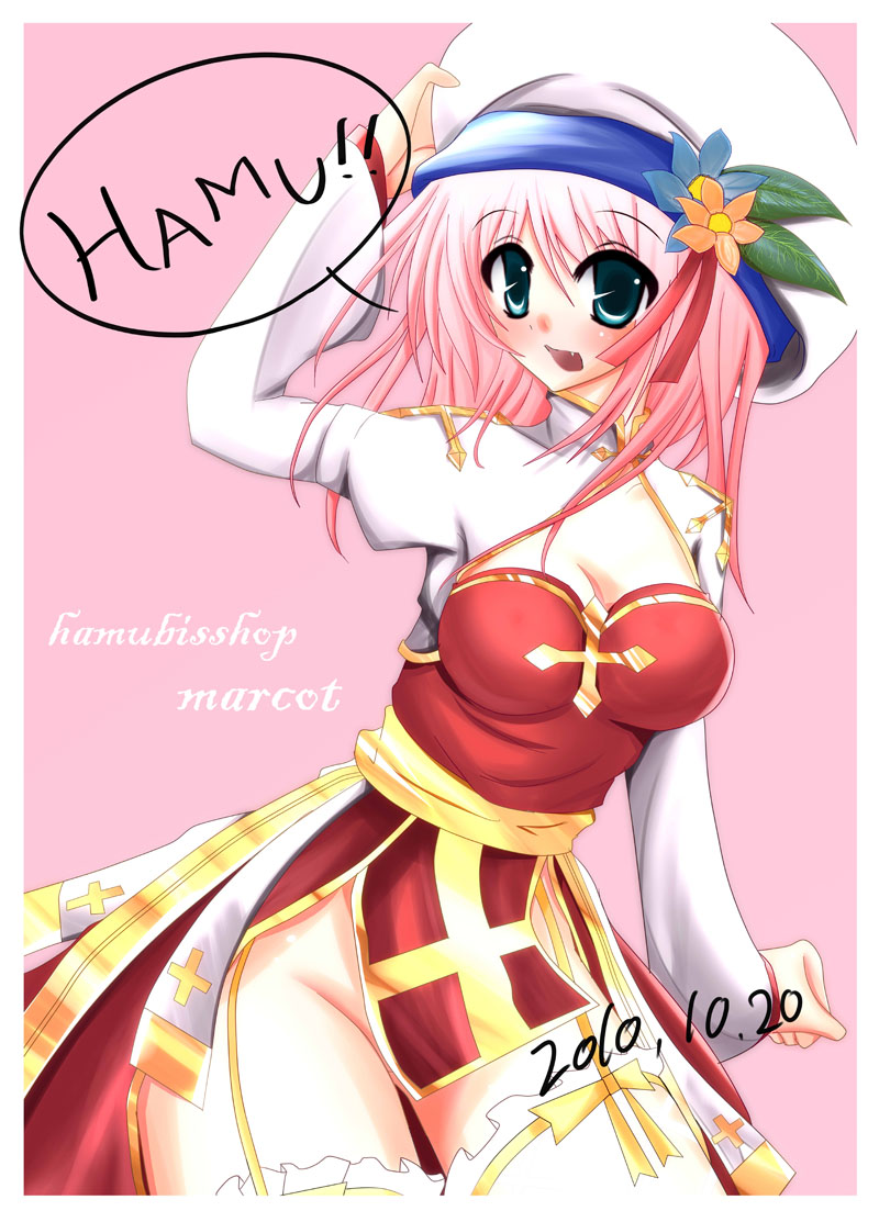 1girlblue eyesblue flowerblushborderbreastscharacter namecleavagecleavage cutoutclothing cutoutcowboy shotcrossdateddressfangflowergroinhand on headwearhathat flowerhat ornamentjuliet sleeveslarge breastsleaf hat ornamentlong hairlong sleeveslooking at viewerno pantiesopen mouthpink backgroundpink flowerpink hairpuffy sleevessashsolotam (ragnarok online)thighhighstwo-tone dresswhite borderwhite dresswhite hatwhite thighhighsyellow sash