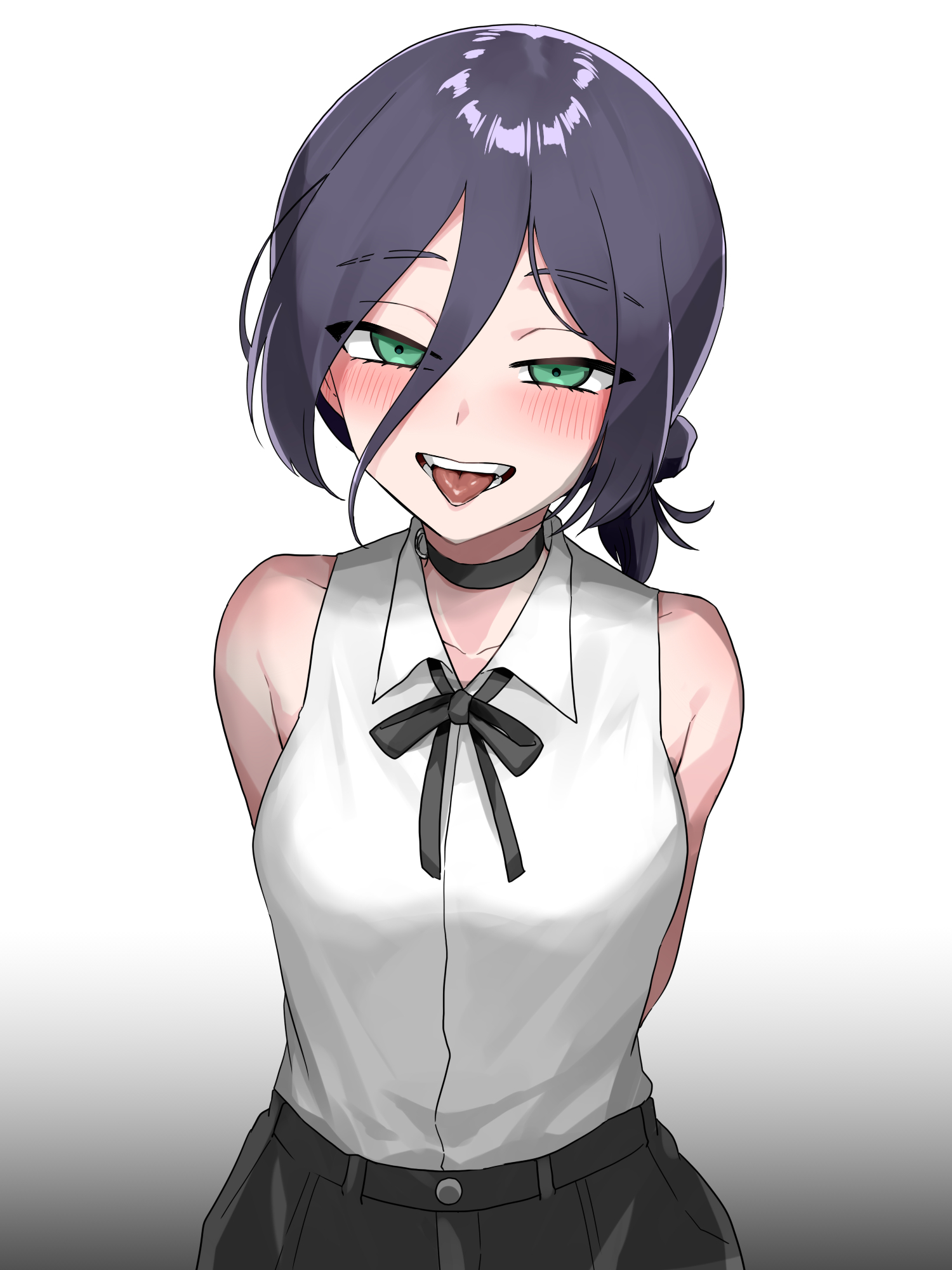 1girlarms behind backbare shouldersblack chokerblack hairblack ribbonblushchokergreen eyesgrey backgroundlooking at viewerneck ribbonribbonshirtsleevelesssleeveless shirtsmilesolotonguetongue outupper bodywhite shirt