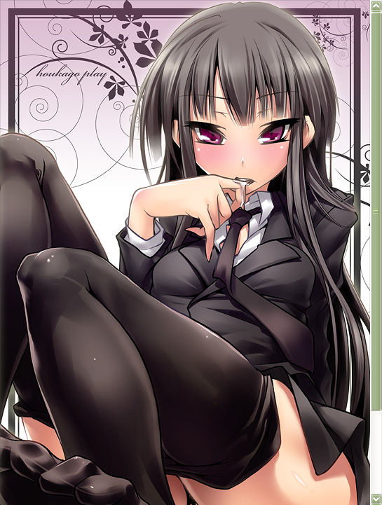 1girlblack hairblack pantyhoseblazerclothes pullfeetfemale focusjacketlong hairlooking at viewernecktiepantyhosepantyhose pullpurple eyessalivasolotoestsurime