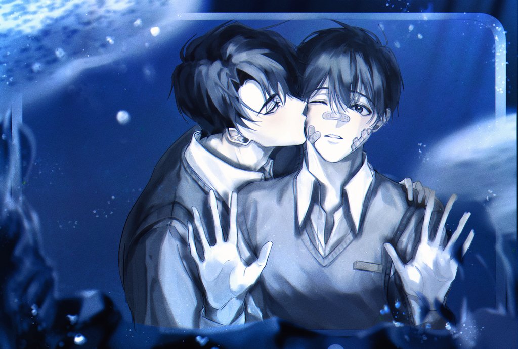 :o2boysagainst glassaquariumbandage on facebandagesbandaidbandaid on facebandaid on noseblack eyesblack hairblue themecollared shirtcoralhair between eyeskissmale focusmultiple boysoldest dreamone eye closedparted lipsschool uniformshirtshort hairupper bodyvestyaoi