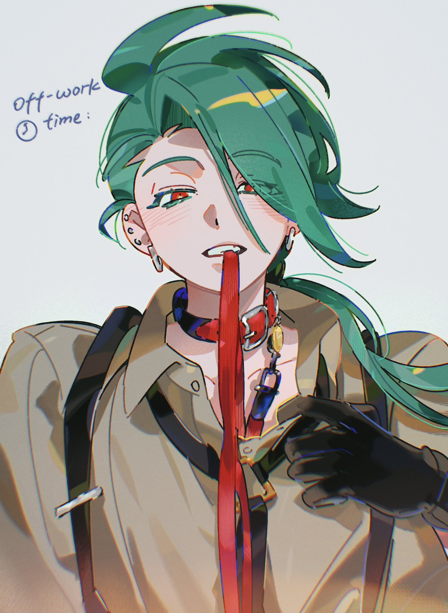 1girlanimal collarblack glovesblack necktiebrown shirtcollarear piercingearringsglovesgreen hairhalf-closed eyesjewelryleashleash in mouthlong hairlooking at viewerlow ponytailmouth holdnecktiepiercingponytailred collarred eyesshirtsimple backgroundsolosuspendersswept bangsupper bodywhite background