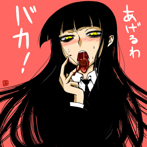 1girlblack hairblunt bangsblushchocolatefemale focuslong hairnecktiesalivasolosweattongueyellow eyes