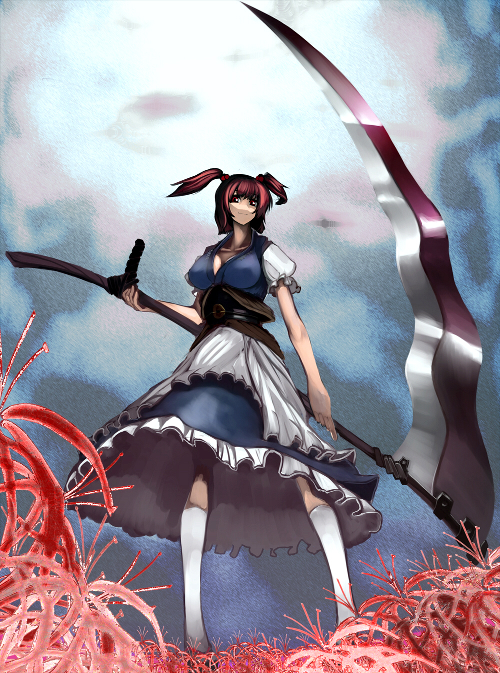 1girlapronbad anatomybad handsbreastscleavagefemale focusflowerfrom belowhair bobbleshair ornamentkneehighslarge breastspink hairpoorly drawnred eyesred flowerred hairscytheshort hairsmilesockssolospider lilystandingwhite socks