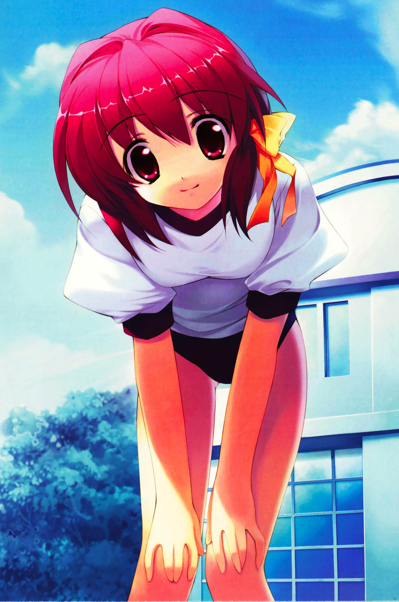 1girlbent overburumadayfemale focusgym uniformhair ribbonhands on own kneespink eyesred hairribbonshort hairskysmilesolotree
