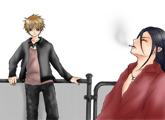2boysblack hairblonde haircigaretteclosed eyeslong hairmultiple boysshort hairsimple backgroundsmoking