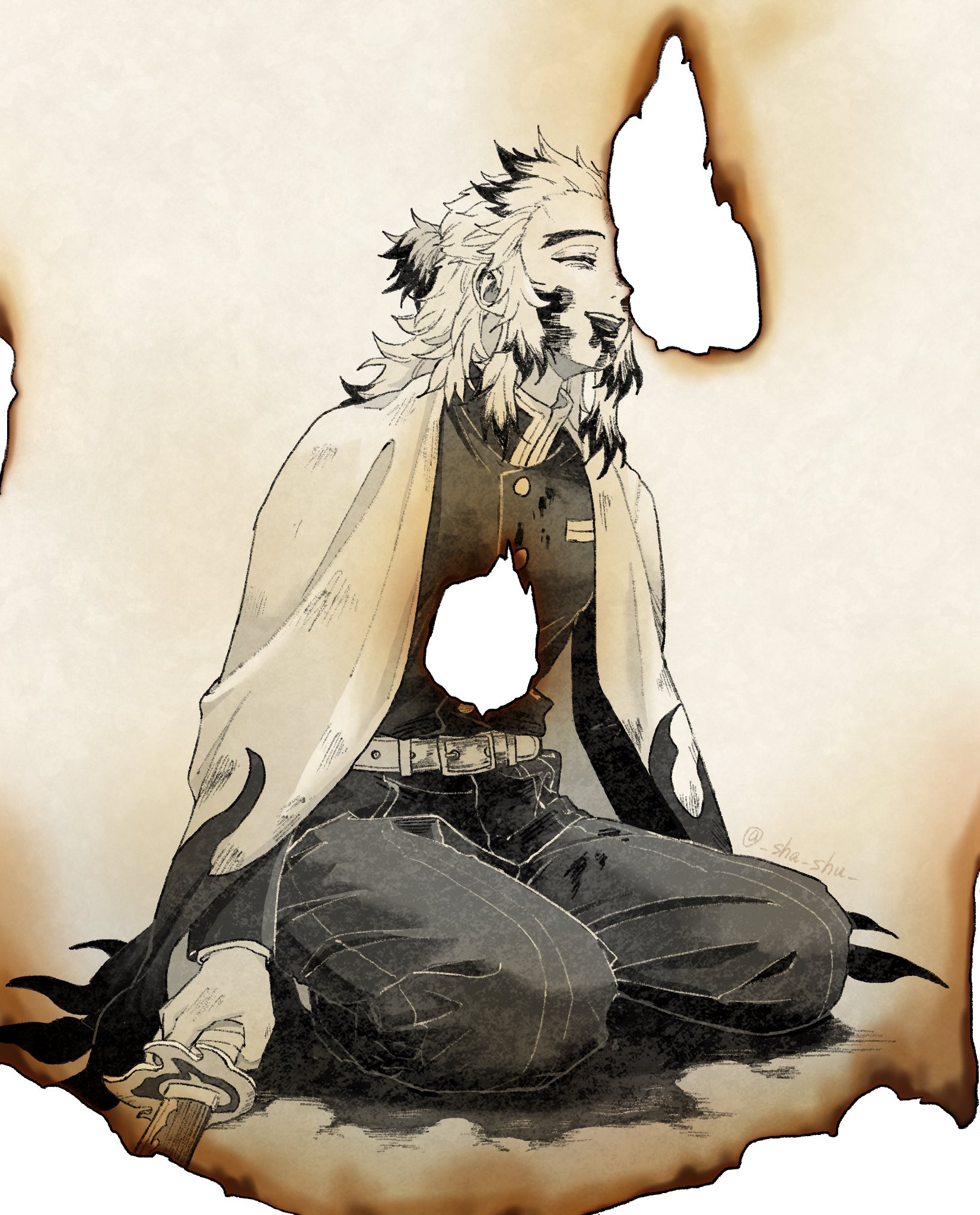 1boyarms at sidesbeltbloodblood from mouthburningburning paperclosed eyescolored tipsdeep wounddefeatdemon slayer uniformforked eyebrowshaoriinjuryjapanese clotheslong hairlong sleevesmale focusmulticolored hairon groundopen mouthpantspaperseizasepiasha shuusittingsmilesoloswordteethupper teeth onlyweapon
