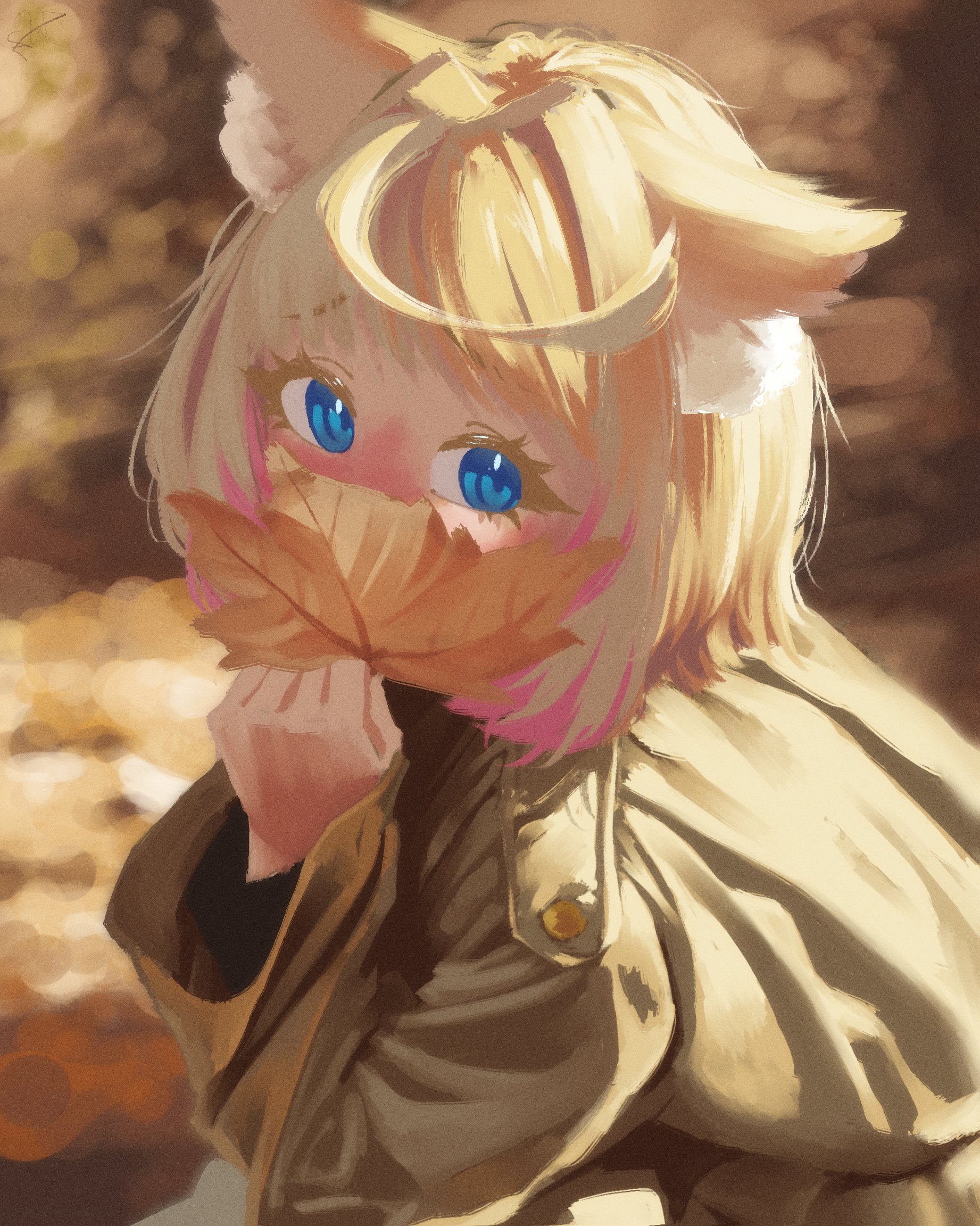 1girlanimal ear fluffanimal earsblonde hairblue eyesblushcoatdog earsdog girlgrey coathair intakesholdingholding leafleaflooking at viewernose blushoutdoorspink streakssolovirtual youtuber