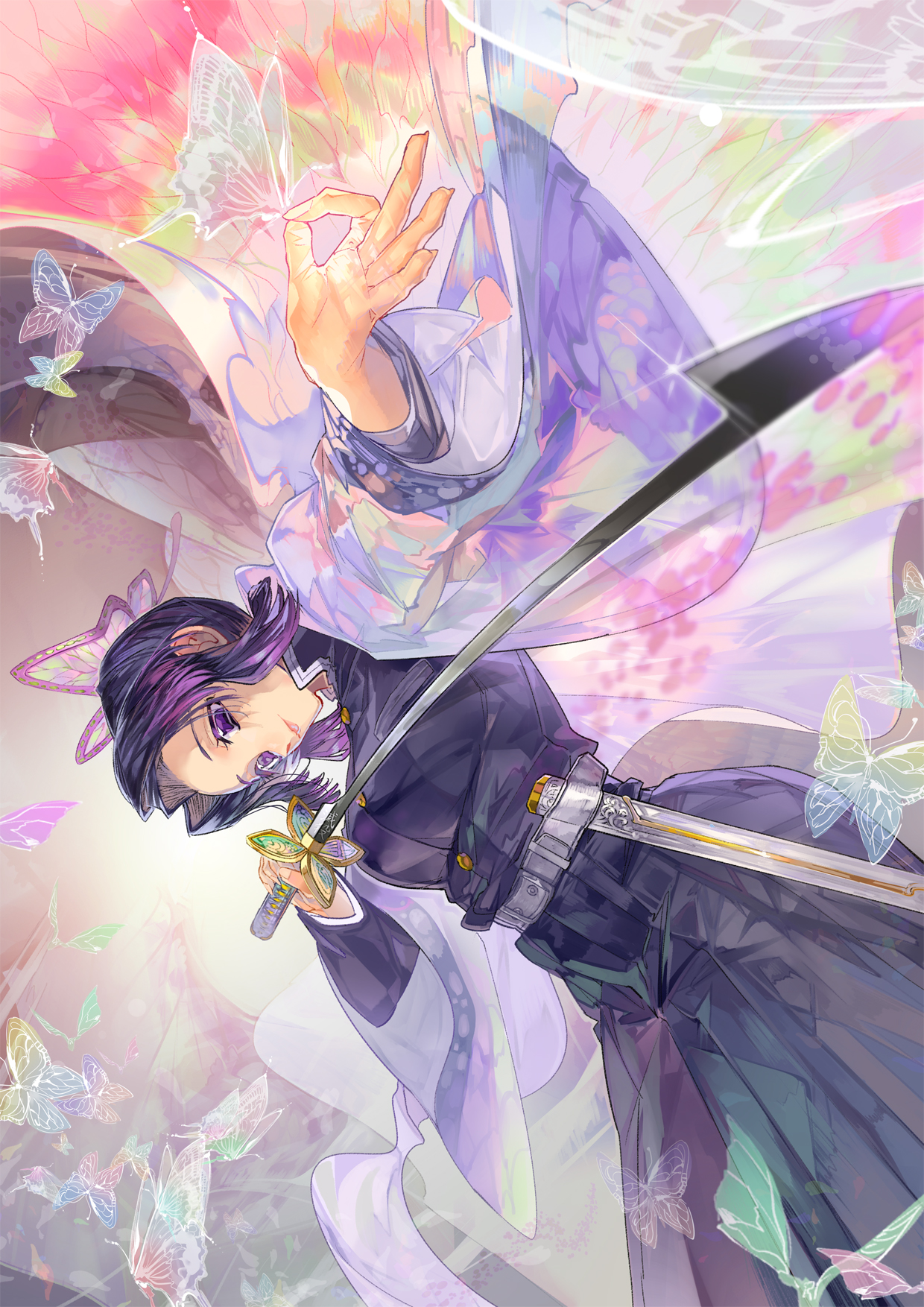 1girlbeltblack hairbreastsbugbutterflybutterfly hair ornamentclosed mouthcowboy shotdemon slayer uniformhair ornamenthaoriholdingholding swordholding weaponinsectjapanese clotheslarge breastslipsticklong sleeveslooking at viewermakeupok signparted bangspink lipspurple eyespurple streaksscabbardsheathshort hairsidewayssoloswordsword writingweaponwhite belt