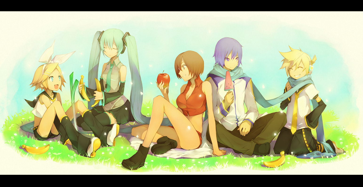 2boys3girlsapplebananabreastscleavagecrossed legsdetached sleevesfoodfruitgrinindian stylekneelinglegsletterboxedmidriffmultiple boysmultiple girlsnecktiepopsiclescarfseizashared clothesshared scarfsittingskirtsmilespring onionthighhighstwintailswatermelon bar