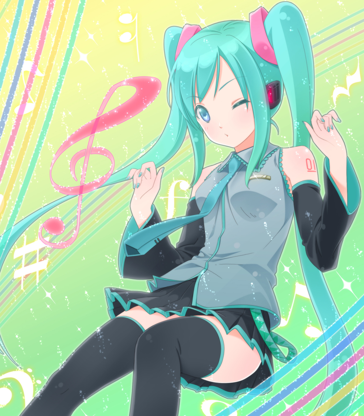 1girlaqua hairarms upblue eyesdetached sleevesfemale focuslong hairmusical notenecktieskirtsolothighhighstwintailsvery long hairwink