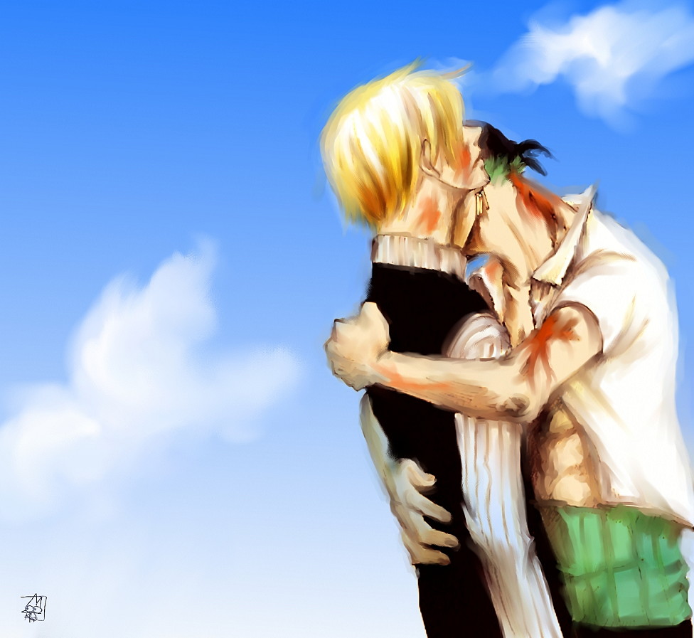 2boysbandanablonde hairbloodearringsfallinggreen hairhair over one eyeharamakihuginjuryjewelrymale focusmultiple boysskystanding