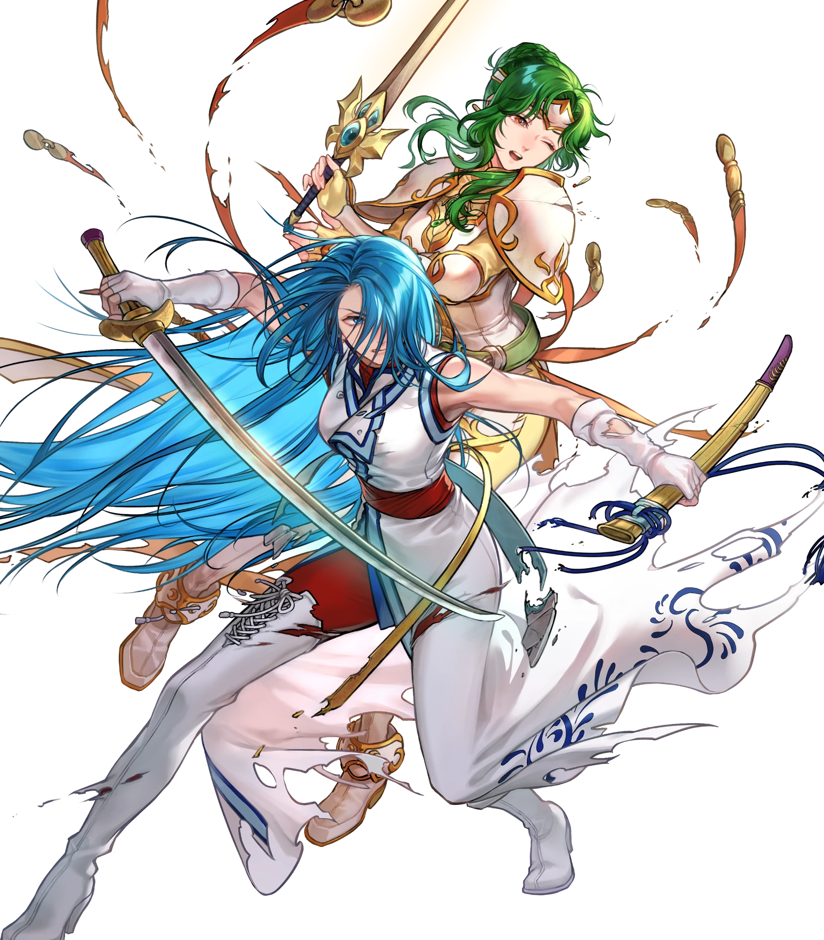 2girlsarmorbare shouldersblue eyesblue hairbreastplatedamagedglovesgold capegreen hairhair bunhair over one eyehigh heelsholdingholding sheathholding swordholding weaponlong hairmultiple girlsone eye closedopen mouthprotectingsheathshoulder armorswordtorn clothesvery long hairweaponwhite gloves