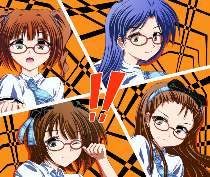 amemiya sayaka, anna lindhurst, kanda aoi, osu! tatakae! ouendan, highres, official art, official wallpaper, 3girls, blonde hair, blush, braid, breasts, brown hair, cheerleader, cleavage, glasses, hair ribbon, long hair, medium breasts, midriff, multiple girls, one eye closed, ouendan, pink hair, pom pom (cheerleading), ribbon, skirt, smile, twintails, wink