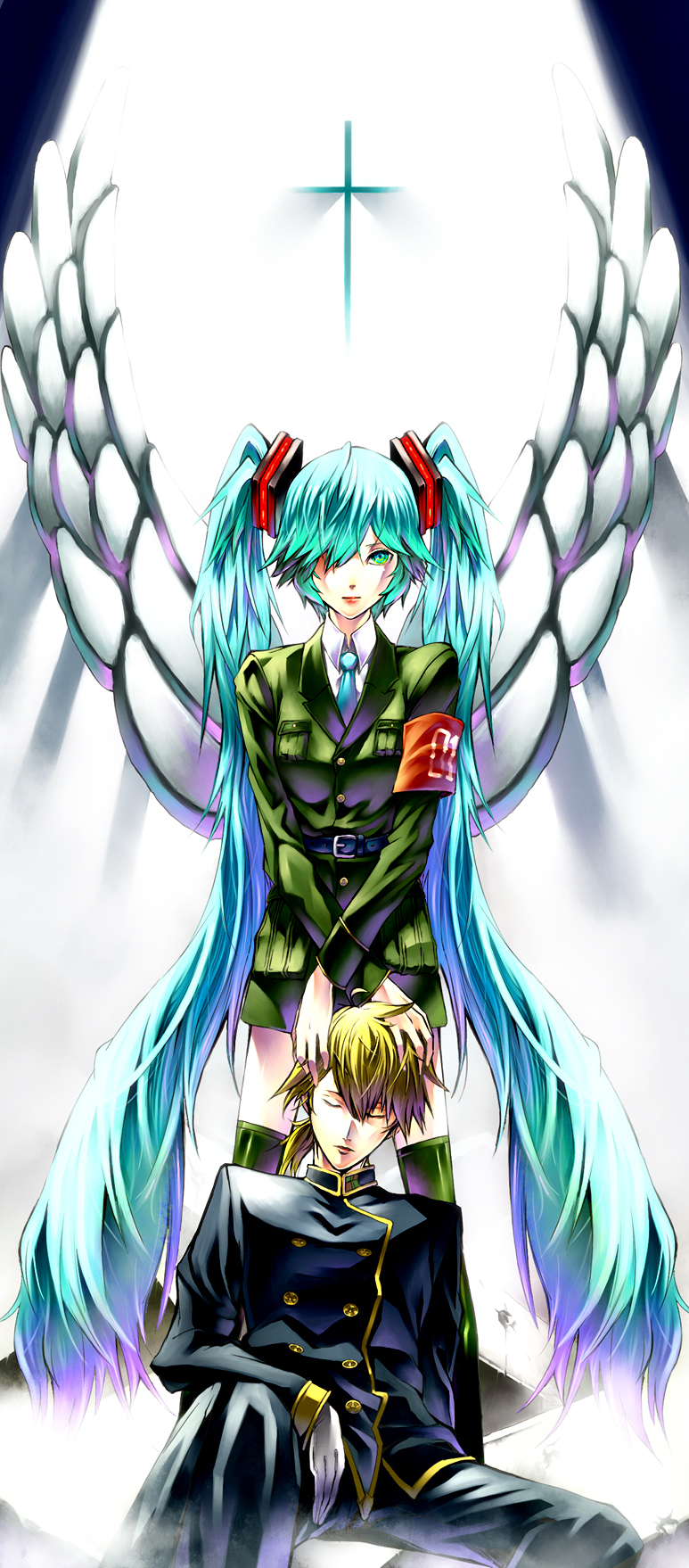 1boy1girlangel wingsaqua haircrosshair over one eyehands on another's headlong hairnecktieskirtstandingthighhighstwintailsvery long hairwings
