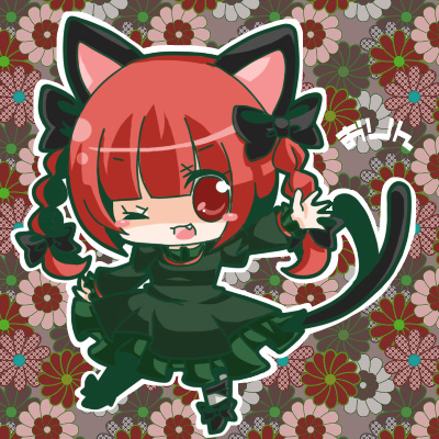 1girlanimal earsbraidcat earscat girlcat tailchibifangfemale focusflowerfull bodyplantred eyesred hairsolostandingtailtwin braidswinkyomム・bad id