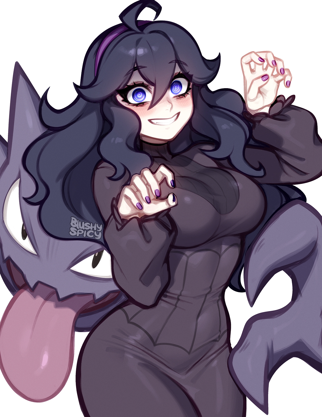 1boy1girlahogebags under eyesbreastscowboy shotdressgen 1 pokemonhair between eyeshairbandlong dresslong hairlong sleeveslooking at viewermessy hairpokemon (creature)purple eyespurple hairbandpurple nailssimple backgroundsmilestandingtonguetongue outwhite background