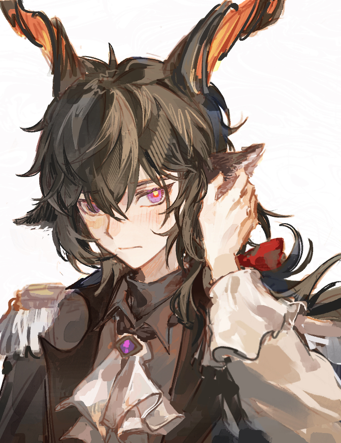 1boyanimal earsascotblack hairblack jacketblack shirtblushbowcollared shirtembarrassedepaulettesfrowngoat boygoat earsgoat hornshair bowhornsjacketlong hairlooking at viewermale focuspettingpurple eyesred bowred pupilsshirtsidelockssimple backgroundsolo focusupper bodywhite ascotwhite backgroundwhite shirt
