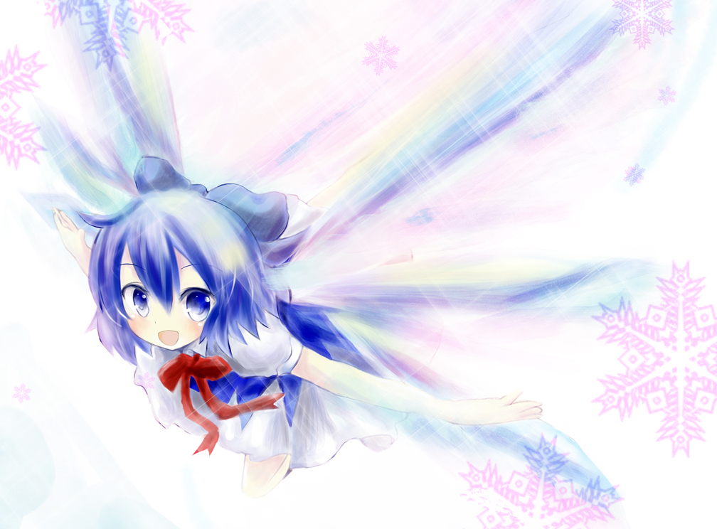 1girlblue eyesblue haircircled 9female focusflyinghair ribbonmatching hair/eyesopen mouthribbonshort hairsmilesnowflakessolowings