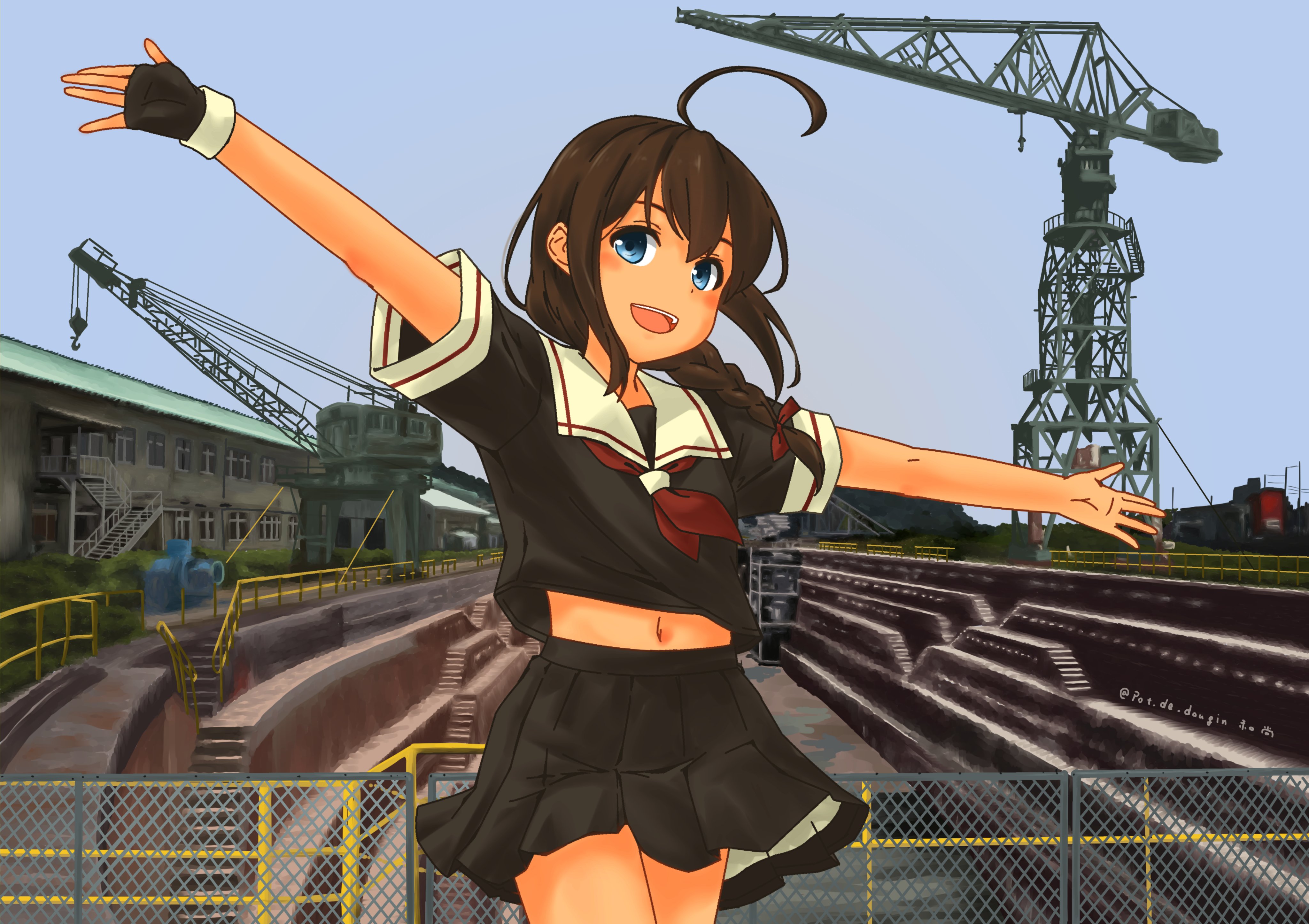 :d1girlahogeblack glovesblack shirtblack skirtblue eyesblue skyblushbowbraidbrown hairbuildingclear skycowboy shotcrane (machine)daydouble-parted bangsdrydockfencefingerless glovesgloveshair between eyeshair bowhair over shoulderhair ribbonhuge ahogelong hairlooking at viewermidriffnaval basenavelneckerchiefopen mouthoutdoorspleated skirtred bowred neckerchiefred ribbonribbonsailor collarshirtshort sleevessidelockssingle braidsingle gloveskirtskysmilesoloteeththighsupper teeth onlywhite sailor collar