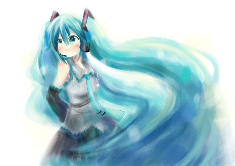 aqua eyesaqua hairdetached sleeveslong hairnecktieskirtsmilesolosquare-end necktiethighhighsvery long hair