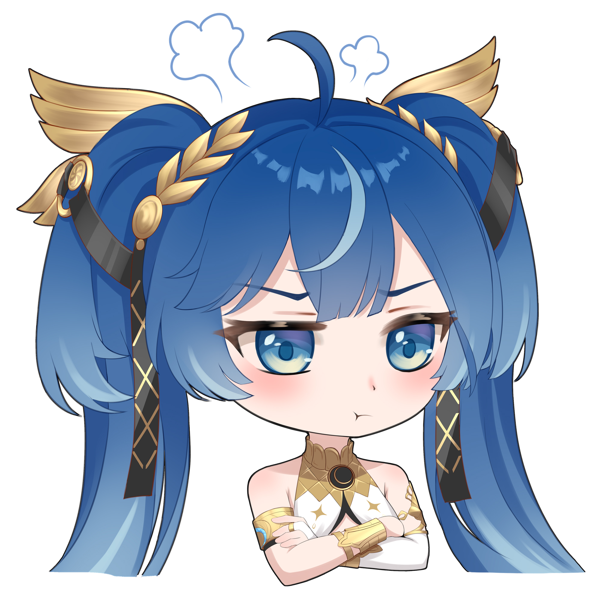 :t1girlahogearmletbare shouldersblue eyesblue hairchibichibi onlycrossed armsjewelrylaurel crownlong hairlooking at viewermulticolored hairpuff of airsimple backgroundsolostreaked hairtwintailsupper bodywhite background