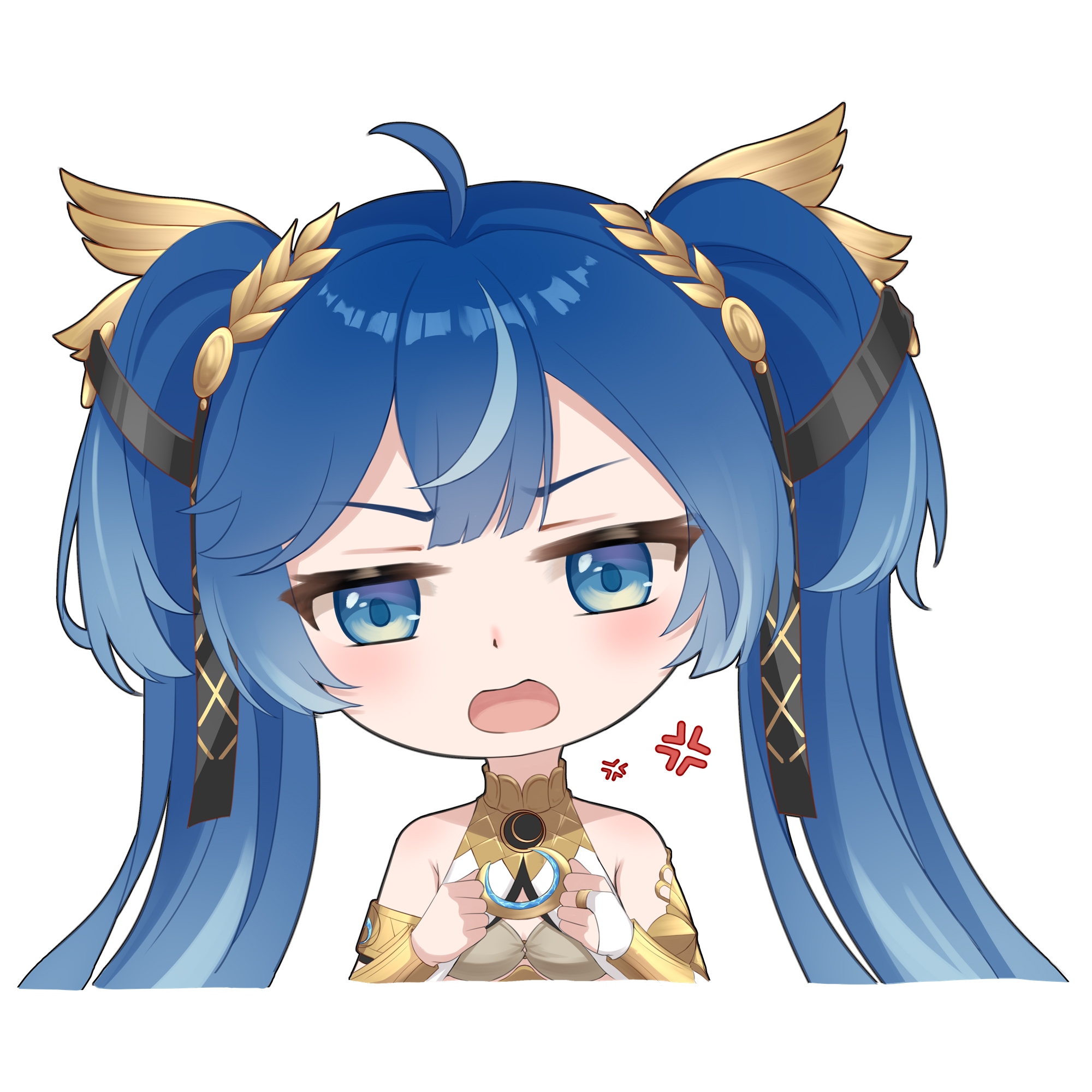 1girlahogeanger veinarmletbare shouldersblue eyesblue hairbridal gauntletschibichibi onlygold braholdingjewelrylaurel crownlooking at viewermulticolored hairopen mouthsimple backgroundsingle bridal gauntletsolostreaked hairtwintailsupper bodywhite backgroundwhite bridal gauntlets