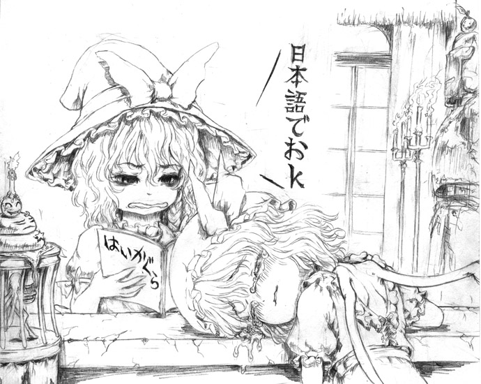 2girlsbookfairyfemale focusgreyscalehatmini personminigirlmonochromemultiple girlssketchsleepingtearswings