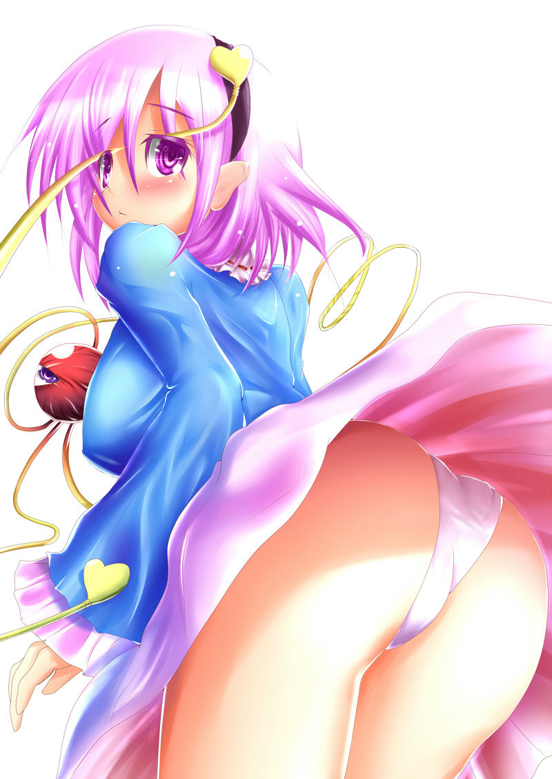 1boy1girlassblushbreastscolored eyelashesfemale focusfrom behindheartlarge breastslooking backpantiespantyshotpink eyespink hairsolothird eyeunderwearupskirt