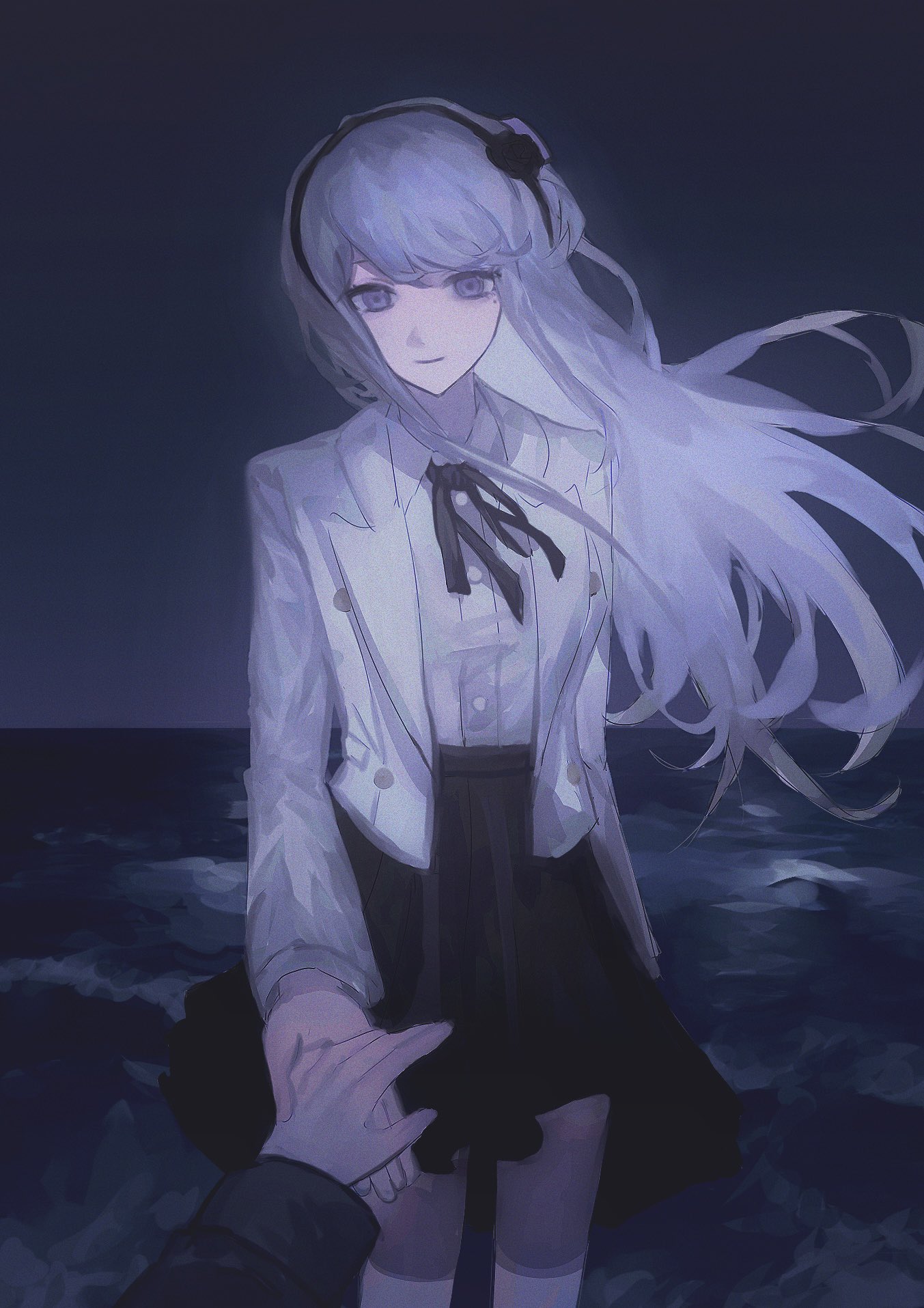 1boy1girlblack hairbandblack ribbonblack skirtclosed mouthcollared shirtfloating hairgrey hairhairbandholding handsjacketlong hairmolemole under eyeneck ribbonnightnight skyopen clothesopen jacketoutdoorspovpov handspurple eyesreachingreaching towards viewerribbonshirtskirtskysmilewaterwhite jacketwhite shirtzucchini 7929