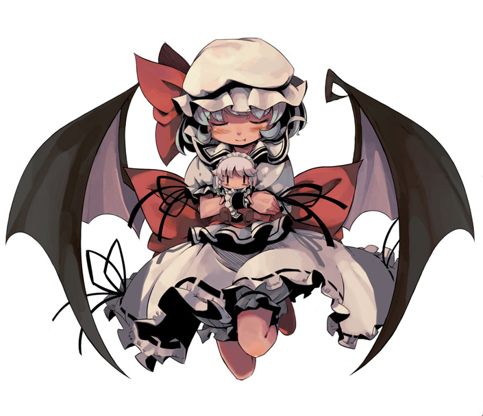 1girlbat wingsblushcharacter dollclosed eyesdolldressfemale focusfrillsfull bodyhathat ribbonmob cappuffy short sleevespuffy sleevesribbonshort hairshort sleevessimple backgroundsolowhite backgroundwhite dresswings
