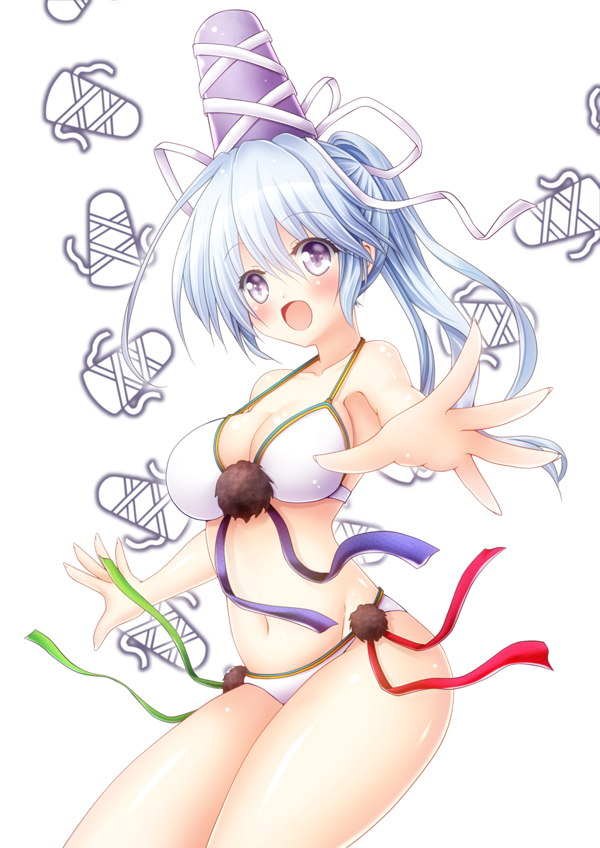 1girlalternate costumebikiniblushgrey hairhatlong hairnavelopen mouthpom pom (clothes)ponytailpurple eyessidelockssmilesoloswimsuittate eboshi