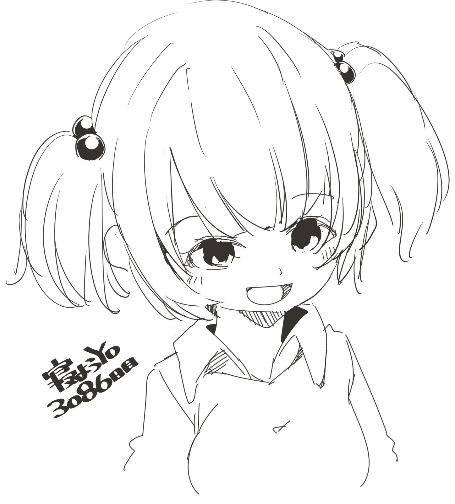 1girlblushbreastshair bobbleshair ornamentlooking at viewermedium breastsmonochromeno headwearsmilesoloupper bodywhite background