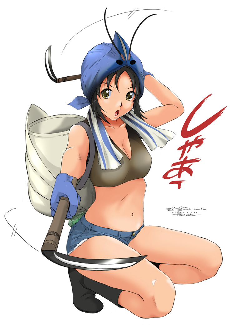 1girlblack hairbreastscleavagedenimdenim shortsdual wieldingfemale focusglovesholdingkama (weapon)midriffshortssicklesimple backgroundsolosquattingtowelweaponyellow eyes