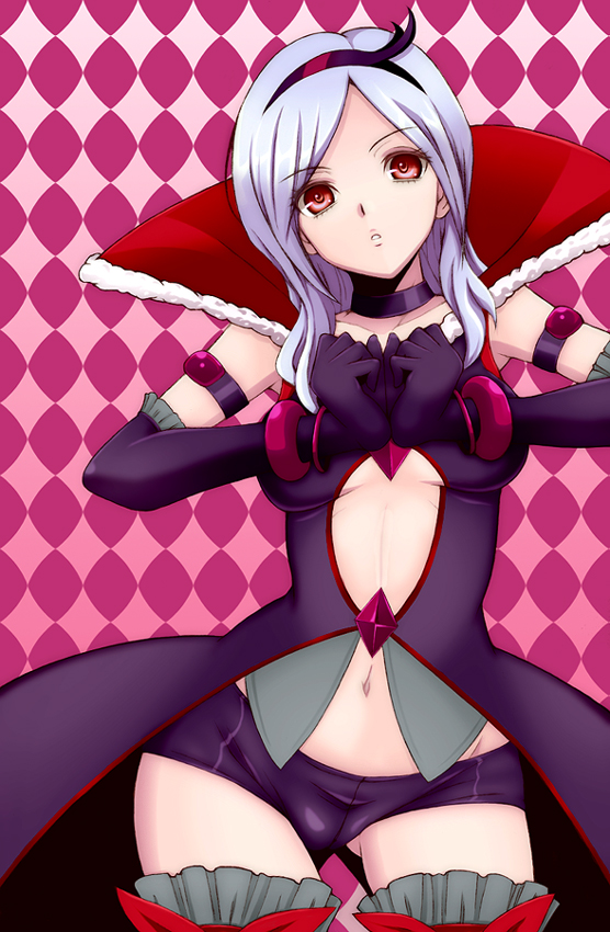 00s1girlargyle backgroundargyle clothesblack shortsbraceletbreastscleavageelbow glovesfemale focusgloveshairbandheadbandjewelrynavelpink backgroundred eyesshort shortsshortssolothighhighs