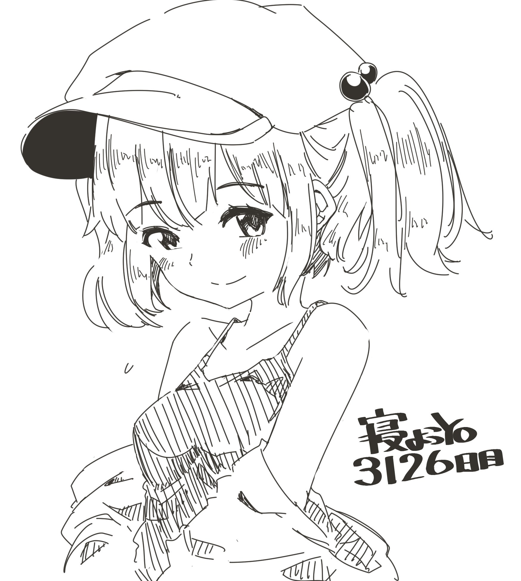 1girlblushbreastsclosed mouthcollarboneflat caphair bobbleshair ornamenthatlooking at viewermedium breastsmonochromesmilesolotank topupper body