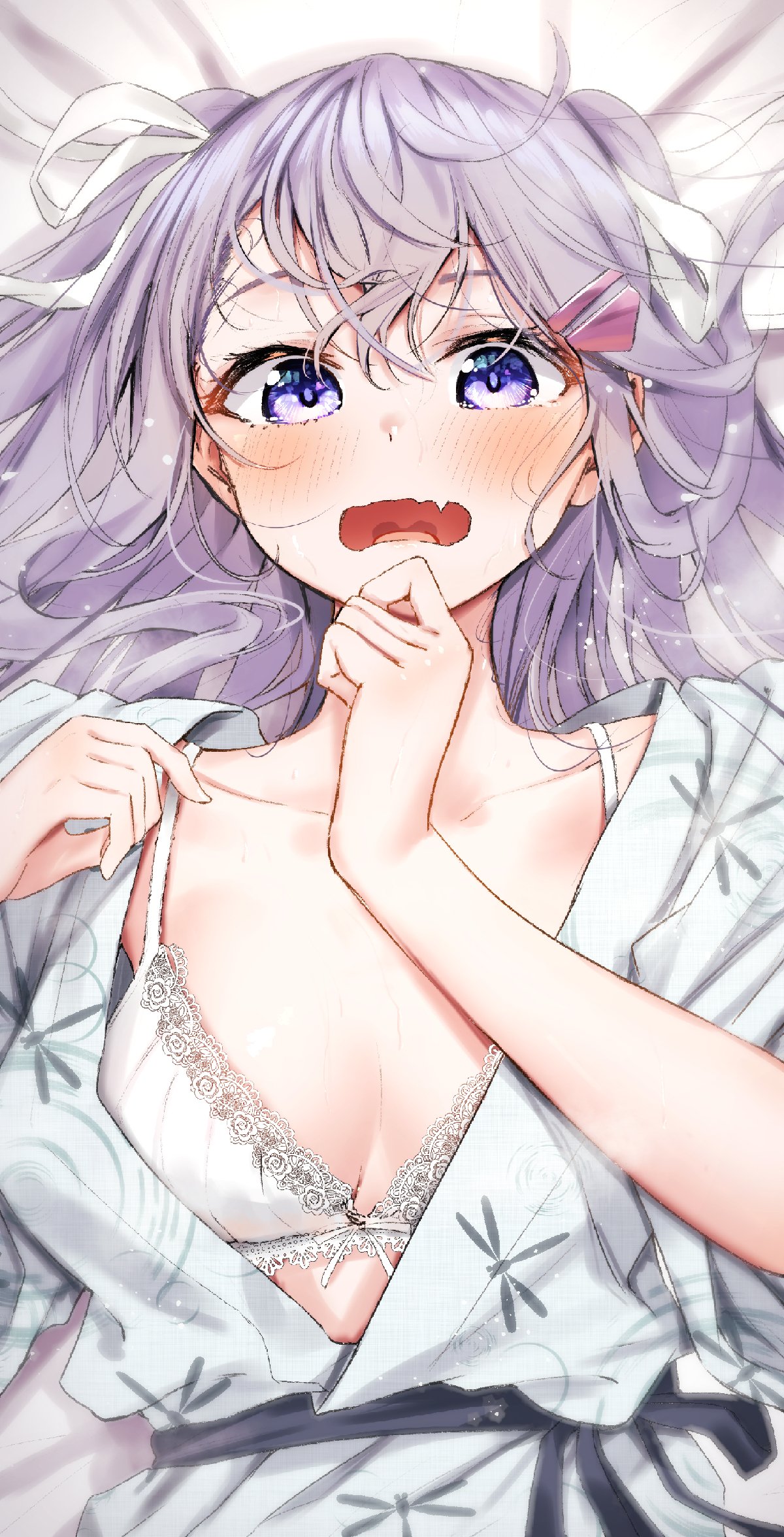 1girlaqua kimonoblushbrabreastscollarbonehair ornamenthair ribbonhairclipjapanese clotheskimonolacelace trimlace-trimmed bralooking at viewerlyingon backopen mouthparallel hairclipspurple eyespurple hairribbonsmall breastssolounderwearupper bodywhite brawhite ribbon