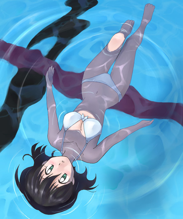 1girlafloatbarefootbikiniblack hairbreastscleavagefemale focusfront-tie topgreen eyesnavelpoolripplesshort hairsolosubmergedswimmingswimsuitupside-downwhite bikini