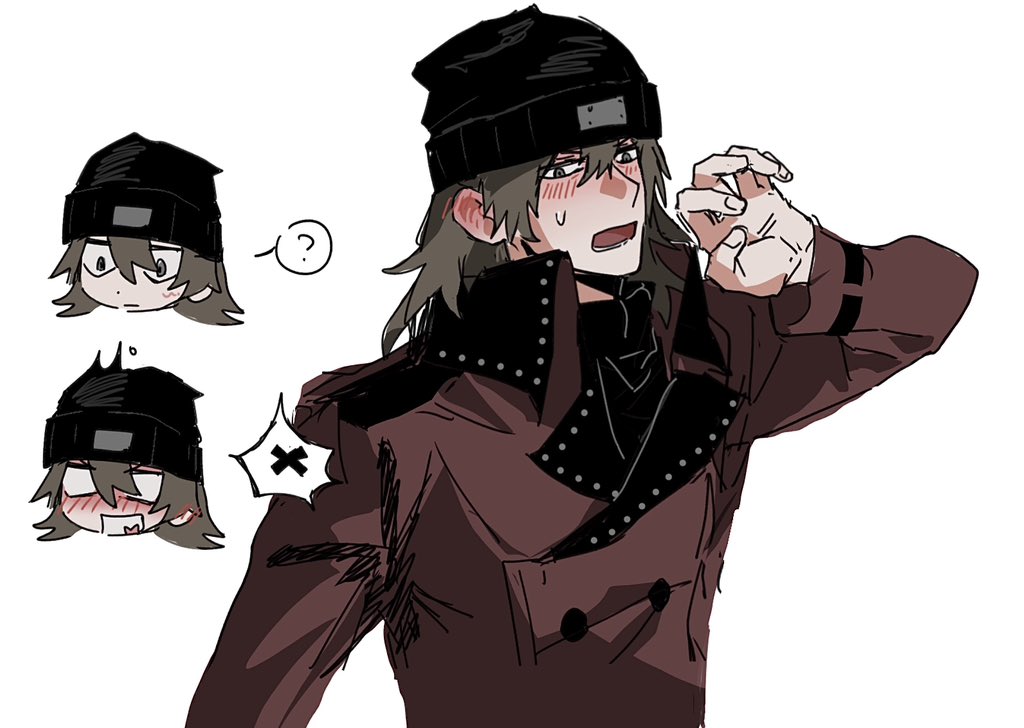 1boybeanieblack hatblushbrown eyesbrown hairchibichibi insetear blushhair between eyeshand uphatjacketlapelslong sleeveslooking at viewerlower teeth onlymale focusmultiple viewsopen mouthred jacketsimple backgroundspoken question markspoken xsweatdropteethupper bodywhite backgroundx (symbol)